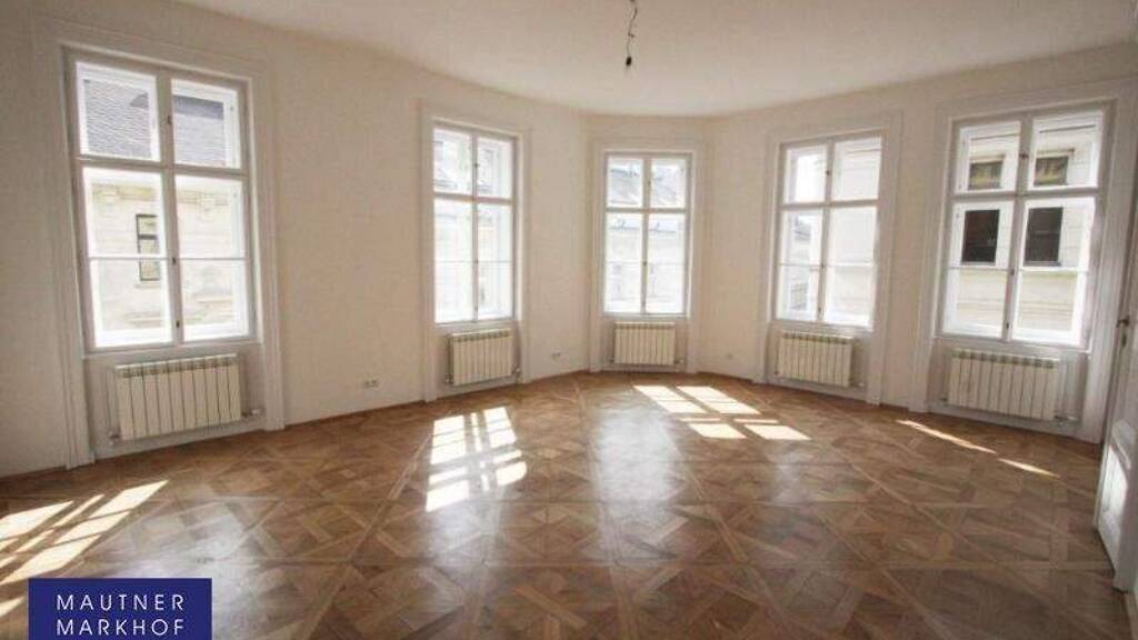 Hochwertiges helles Appartement im Stilaltbau, 4.Liftstock - zentral Innenstadt Es handelt sich um eine repräsentative, südlich ausgerichtete, perfekt gelegene ca. 166m² große Altbauwohnung - teilweise Sternparkett, Doppelflügeltüren - im 4. Liftstock eines gepflegten Jahrhundertwendehauses in unmittelbarer Nähe zum Graben! Das mit Gasetagenheizung und Klimaanlage in allen Zimmern ausgestattete Objekt umfasst: