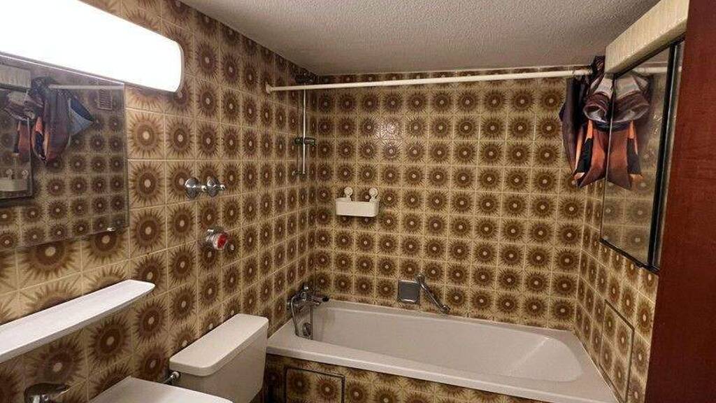 Die Küchenzeile, die sich direkt hinter der Eingangstür befindet, ist mit einem Backofen, einem Herd sowie einem Spülbecken ausgestattet. Das angrenzende Badezimmer ist vergleichsweise großzügig und verfügt über ein Waschbecken, ein WC sowie eine Badewanne.