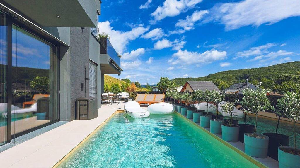Herzstück ist die offene Wohnküche mit maßgefertigter Tischlerküche und Miele-Geräten, nahtlos verbunden mit dem Außenbereich samt beheizbarem Pool (38?°C) und Outdoorküche.
