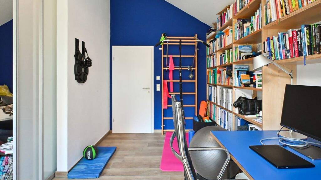 Über eine offene Treppe gelangen Sie ins Obergeschoss. Hier erwarten Sie drei Schlafzimmer, von denen zwei kleinere zu einem großzügigen Raum verbunden wurden - ideal als geräumiges Kinder- oder Arbeitszimmer. Das große Badezimmer überzeugt mit Dusche, Badewanne und einer integrierten Infrarotsauna - perfekt für Wellnessmomente zuhause.