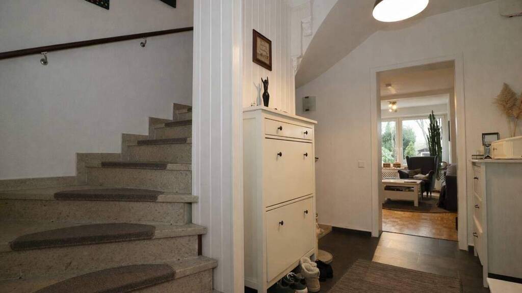 Sie betreten das Haus und befinden sich in Ihrer Diele mit Garderobennische. Von hier aus erschließen sich alle Räume des Erdgeschosses. Direkt zur linken Seite befindet sich das Gäste-WC mit Fenster. Zur Rechten erreichen Sie die offen gestaltete Küche. Von hier aus blicken Sie in den Vorgarten des Hauses. In der Küche befindet sich ein schwarzer Fliesenboden, während in der Diele 2017 ein Vinylboden verlegt wurde. Die Einbauküche ...