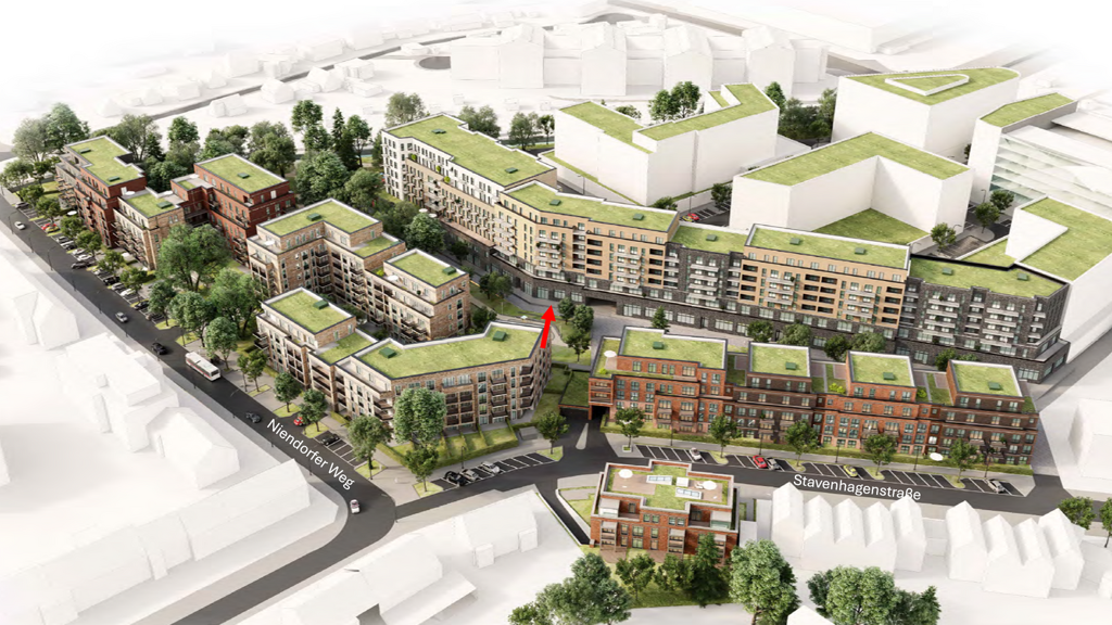 Das Grundstück ist als Urbanes Gebiet ausgewiesen – im Südosten schließt Wohnbebauung an, im Norden ein Gewerbegebiet. Der Flughafen Hamburg ist mit dem Auto in ca. 9 Minuten erreichbar, die Bushaltestelle der Linie 23 liegt unmittelbar am Objekt (Ecke Niendorfer Weg / Stavenhagenstraße) und ermöglicht eine gute Anbindung zur U2 Niendorfer Markt in ca. 6 Minuten.