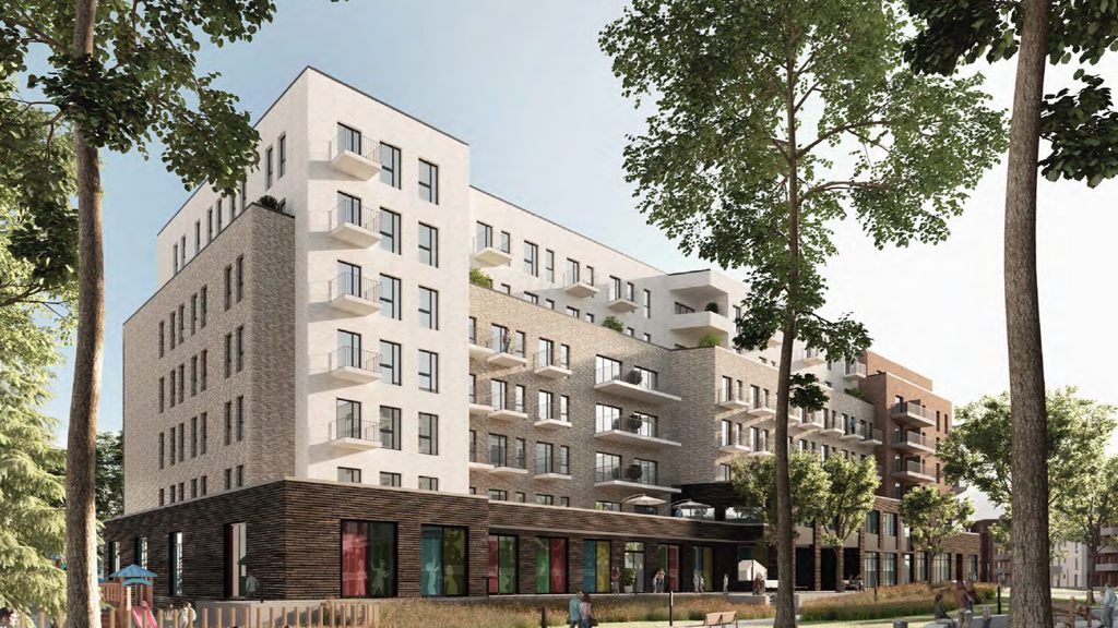 Bei dem Neubauprojekt handelt es sich um ein modernes Hybridgebäude in energieeffizienter KfW-40-Bauweise, das Wohnraum und Gewerbe unter einem Dach vereint. Das Gebäude umfasst künftig 126 geförderte Mietwohnungen, vielfältige Büro- und Gewerbeflächen sowie eine große Tiefgarage.