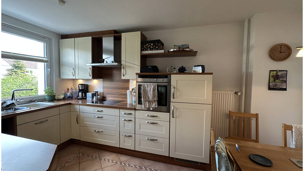 Beim Betreten des Hauses gelangt man zunächst in die zweite Ebene, die eine moderne Küche sowie ein Gäste-WC umfasst. Diese Etage bildet den Eingang zum Haus und bietet durch die offene Raumgestaltung eine einladende Atmosphäre. Die Küche wurde 2008 saniert und ist gut ausgestattet, sodass sie den heutigen Anforderungen entspricht. Auch das Gäste-WC wurde 2021 renoviert und fügt sich harmonisch in das Gesamtbild ein.