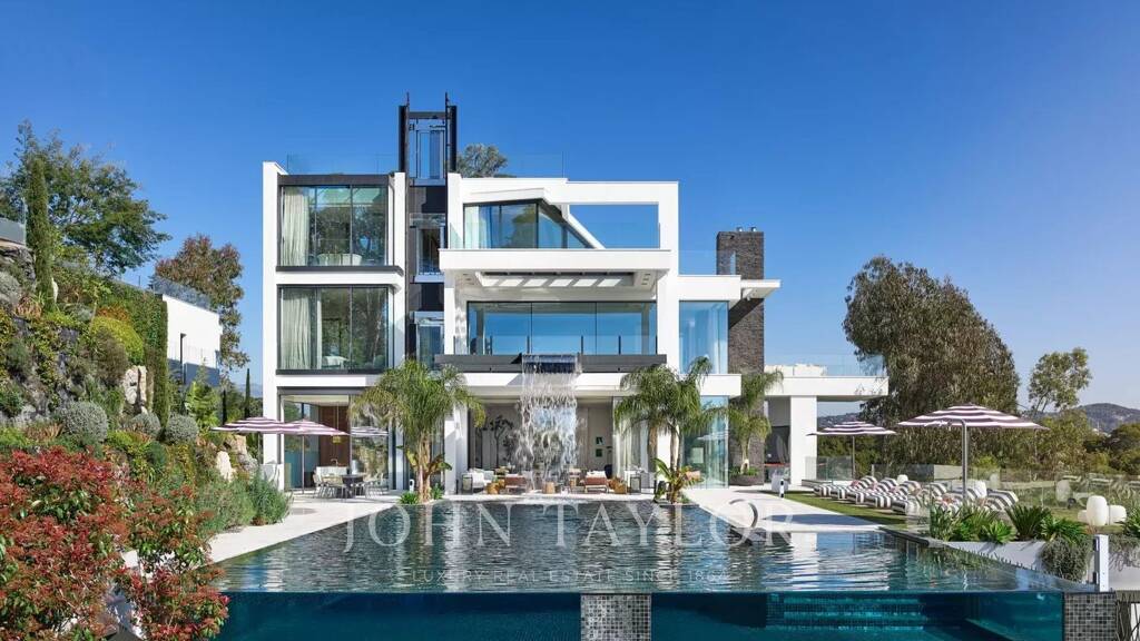 Die Außenbereiche sind ebenso prächtig, mit einer Terrasse im Erdgeschoss, die mit einer Terrasse rund um den Pool mit Panoramablick auf das Meer, einem Feuerkorb, einem Grill und einem Essbereich ausgestattet ist, mit Blick auf den beheizten Pool und zwei Wasserfälle. Die oberen Etagen bieten ausgestattete Panoramaterrassen und Entspannungsbereiche mit Liegestühlen und Feuerkorb, während der mediterrane Terrassengarten einen Bouleplatz und einen Gemüsegarten umfasst.