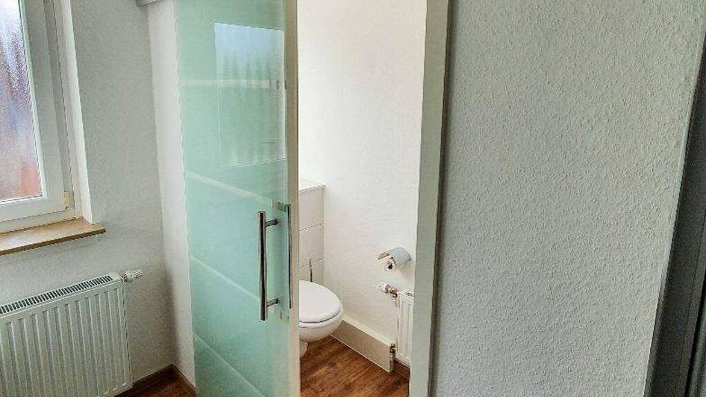 Das Badezimmer ist modern ausgestattet und überzeugt mit zeitgemäßem Design. Eine Einbauküche steht zur Verfügung und kann für monatlich 30 € genutzt werden. Besonders praktisch ist der kleine Abstellraum innerhalb der Wohnung, in dem auch der Anschluss für die Waschmaschine vorhanden ist.
