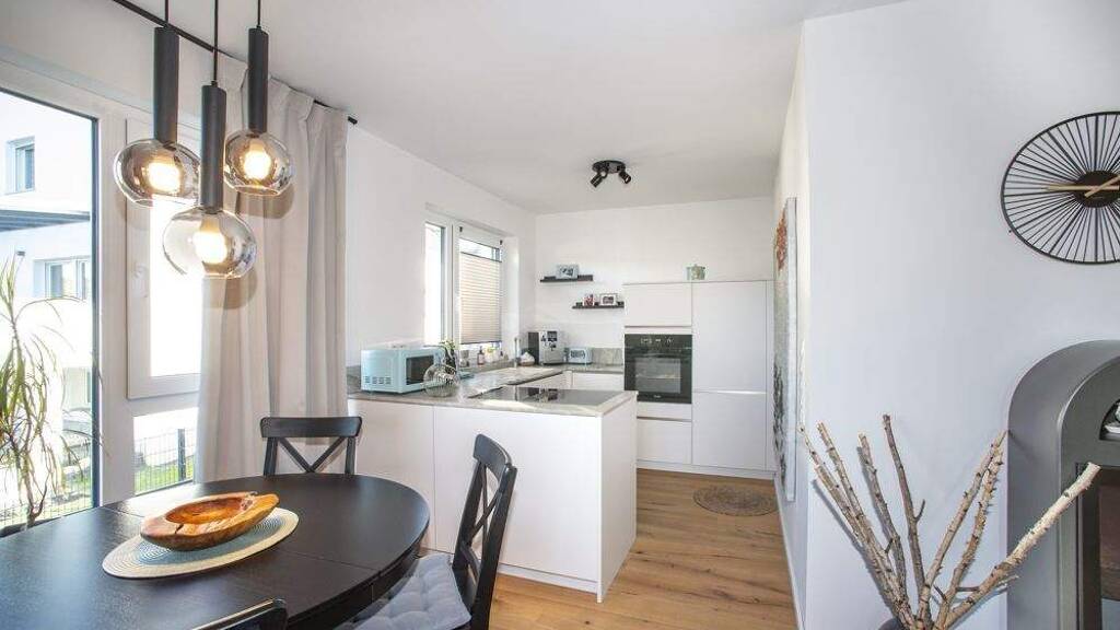 Große Fensterflächen sorgen für helle Räume und eine angenehme Atmosphäre. Hochwertige Parkett- und Fliesenböden, dreifach verglaste Fenster sowie eine Fußbodenheizung in allen Wohnräumen unterstreichen den gehobenen Ausstattungsstandard.