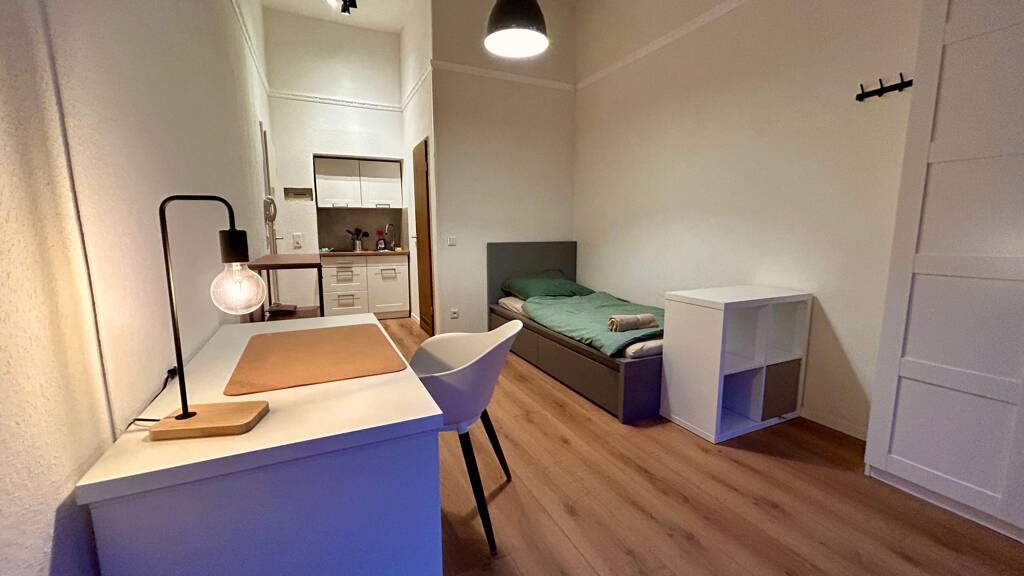 Das schöne Single-Apartment liegt im Erdgeschoss eines Mehrfamilienhauses im Düsseldorfer Stadtteil Bilk und ist voll möbliert. Die kompakte Wohnung hat kleine Kochnische, die mit den gängigsten Küchenutensilien ausgestattet ist. Der Wohn- und Schlafbereich ist ebenfalls so ausgestattet, dass man nur noch seine persönlichen Sachen mitbringen muss, ein schneller Internetanschluss ist ebenfalls vorhanden. Die Wohnung wird zum Fixpreis von 750 EUR vermietet. Alle Kosten für Miete, Möblierung, Strom, Wasser und Internet sind in dem Preis enthalten.