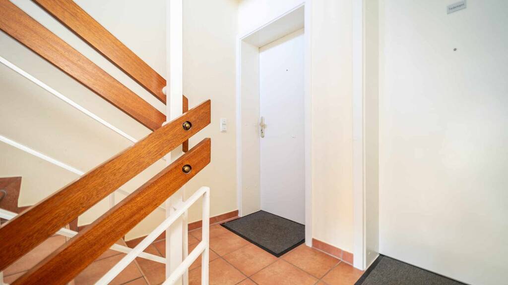 Über die Treppe erreichen Sie die obere Ebene im Hochparterre, die den privaten Rückzugsbereich bildet. Hier befinden sich zwei gut geschnittene Schlafzimmer, die mit ihrer ruhigen Lage und dem Blick ins Grüne für erholsame Nächte sorgen. Das größere Schlafzimmer eignet sich hervorragend als Hauptschlafzimmer, während das zweite Zimmer flexibel als Kinder-, Gäste- oder Arbeitszimmer genutzt werden kann.