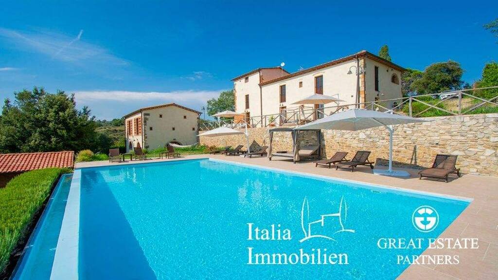 Dieses herrliche Anwesen, umgeben von Grün und mit Panoramablick auf die Hügel von Pisa, liegt in der Gemeinde Palaia und besteht aus zwei Gebäuden: dem Hauptbauernhaus und einem Gästehaus. Das 302 m² große Haupthaus verteilt sich auf 2 Ebenen und ein Zwischengeschoss: Im Erdgeschoss befindet sich eine große Terrasse, die ideal für sommerliche Mahlzeiten ist und zum Haus führt. Hier erwartet Sie ein geräumiger Wohnbereich mit einem Eingangsbereich, einem Wohnzimmer mit Flügeltüren zum Holzofenbereich, einem Esszimmer, einem weiteren Wohnzimmer, einem Abstellraum und einem Badezimmer. Außerdem gibt es auf dieser Ebene eine Waschküche. Im ersten Stock, der über eine Innentreppe zu erreichen ist, befindet sich der gesamte Schlafbereich, bestehend aus vier schönen Schlafzimmern mit eigenen Bädern. Eines der Schlafzimmer verfügt außerdem über ein Zwischengeschoss, in dem ein weiteres Zimmer eingerichtet werden kann. Das zweite Gebäude mit 114 m², das Gästehaus, ist auf zwei Ebenen verteilt. Im Erdgeschoss gibt es ein großes Wohnzimmer mit einem Essbereich und einer Außenterrasse, während sich im ersten Stock der Schlafbereich mit zwei Schlafzimmern befindet, die jeweils über ein eigenes Bad verfügen. Das Anwesen ist umgeben von ca. 8 Hektar Land, mehreren Panoramaterrassen (ca. 50 qm) und einem Infinity-Pool von 12 x 6 Metern. Es gibt auch ein weiteres kleines Gebäude, das als Lagerraum genutzt wird (23 qm).