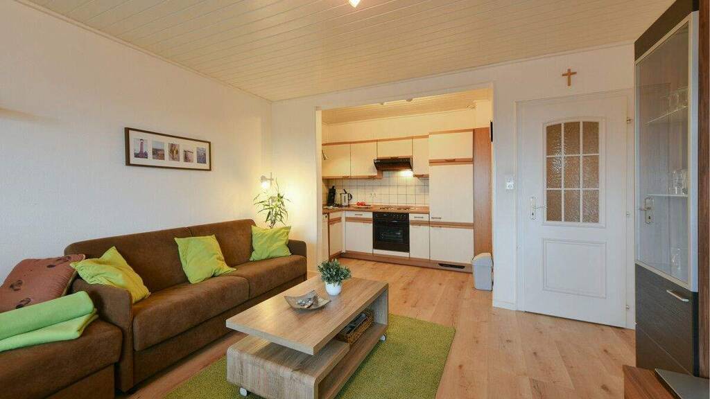 Komfortabel, hell, dazu strandnah: Die ca. 46 m² große Wohnung befindet sich in der zweiten Etage des Appartement-Hauses "Südwind". Eines ihrer Highlights ist der großzügig verglaste und nach Süden ausgerichtete Erker. Vom frühen Morgen bis zum späten Abend sorgt das hereinfallende Sonnenlicht in dem Wohn- und Essbereich für eine einladende und wohlig warme Atmosphäre. Perfekt für einen Kurztrip, aber auch für einen langen und entspannten Familienurlaub. Über den Flur gelangt man in das separate Schlafzimmer mit Waschgelegenheit sowie in den geräumigen Wohnbereich. Hier befindet sich nicht nur das helle Wohnzimmer und die offene Küche, sondern auch der Essbereich. Gut durchdacht: Die Nutzung der räumlich getrennten Schlafmöglichkeiten ermöglicht die großzügige Schlafcouch im Wohnbereich.