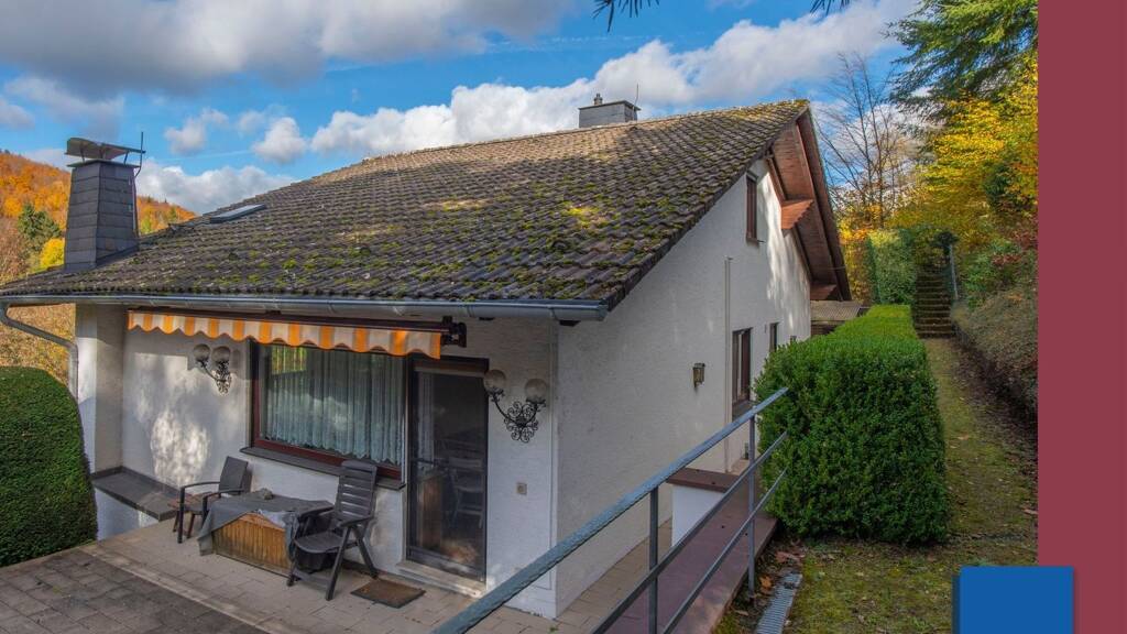 Das 597 m² große Grundstück im Felshang wurde 1973 mit einem massiven Einfamilienhaus in stark gehobener Ausstattung erbaut. Die angelegte Terrassierung hat verschiedene Freisitze rund um das Gebäude ermöglicht. Daneben gibt es zwei Aussichtsbalkone mit Blick in die herrliche Taunuslandschaft.