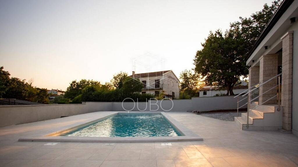 Der zentrale Bereich des Hauses ist nach einem modernen Open-Space-Konzept gestaltet, das Küche, Essbereich und Wohnzimmer zu einem großzügigen und lichtdurchfluteten Raum verbindet. Diese Raumaufteilung ermöglicht eine angenehme Kommunikation zwischen den Bewohnern und schafft eine warme und einladende Atmosphäre. Vom Essbereich aus gelangt man direkt auf die Sonnenterrasse mit Swimmingpool, die den perfekten Ort zum Entspannen und Genießen der warmen istrischen Tage bietet. Dieser Außenbereich bietet höchsten Komfort für gemeinsame Stunden mit Familie und Freunden sowie für Momente der Ruhe und Erholung.