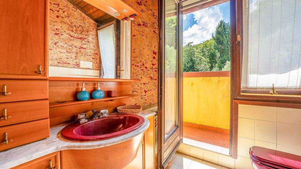 Diese Villa in Lesa mit Seeblick befindet sich in einer ruhigen von Grün umgebenen Wohngegend. Sie besticht durch ihre originelle Architektur und großzügige Räume und bietet viel Potenzial für individuelle Gestaltung.
