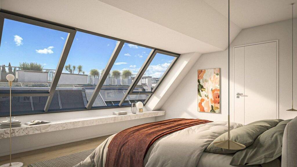 Auf der 2. Ebene erwartet Sie eine atemraubend geräumige Wohnküche mit insgesamt über 61 qm sowie der Master-Bedroom mit en Suite-Bad. Genügend Stauraum und ein Gäste-WC sind natürlich ebenfalls eingeplant. Ein weiteres Highlight ist die rund 19 qm große Terrasse direkt neben dem Küchenbereich.