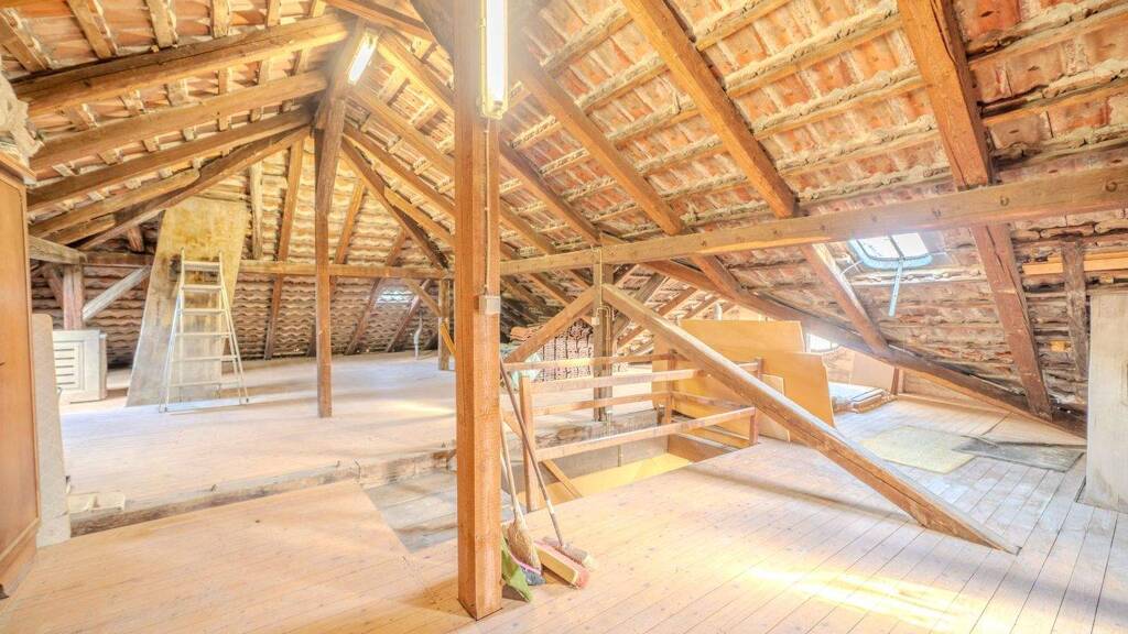 Die Innenräume zeichnen sich durch eine großzügige Deckenhöhe von 3,60 m aus und sind reich an originaler Bausubstanz: Kunstvolle Stuckdecken, teilweise erhaltene historische Fliesen, edles Parkett sowie imposante, großformatige Doppelfenster mit Rundbögen prägen das stilvolle Ambiente. Mehrere original erhaltene Kaminöfen setzen dekorative Akzente.