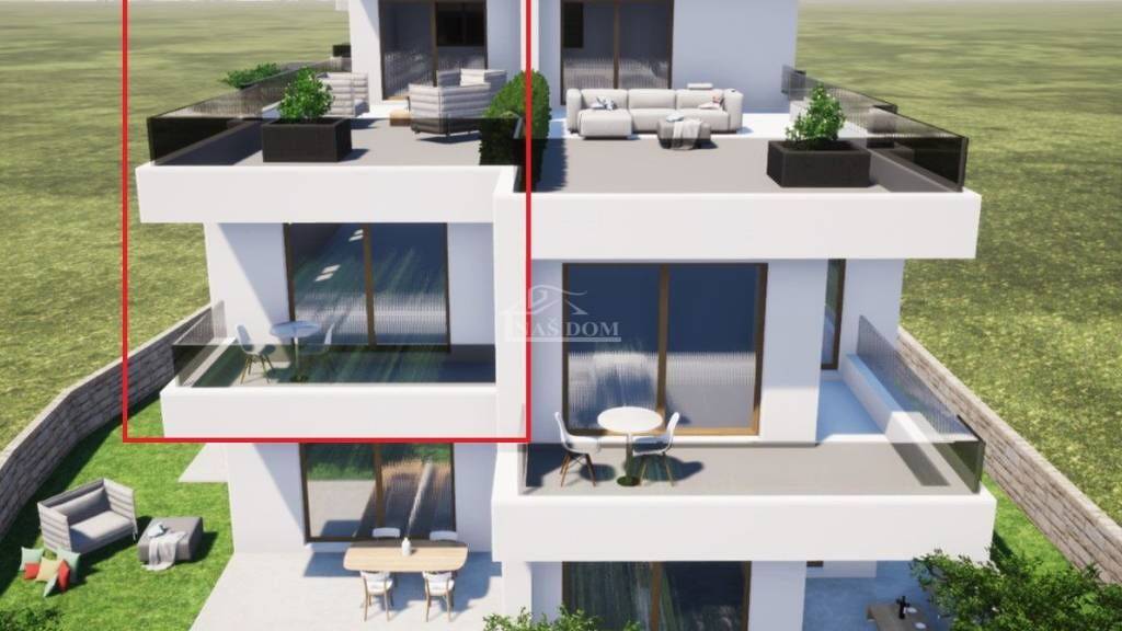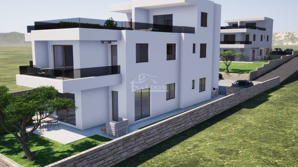 TRIBUNJ - SOVLJE, ein kleineres Gebäude im Bau mit 4 Wohneinheiten, nur 400 m vom Strand und Zentrum entfernt, wird eine zweigeschossige Wohnung mit Dachterrasse verkauft, gekennzeichnet als WOHNUNG S3 - zweigeschossige Wohnung mit einer Gesamtnutzfläche von 108,13 m2, bestehend aus einer Etage mit Flur, Küche mit Essbereich und Wohnzimmer, Terrasse mit 9,44 m2 mit Meerblick, zwei Schlafzimmern, Badezimmer sowie einer Dachterrasse mit 35,64 m2, die aus einer Sommerküche von 18,56 m2, einer überdachten Terrasse von 11,14 m2 und einer unüberdachten Terrasse mit 57,18 m2 mit Panoramablick auf das Meer besteht, sowie einem zugehörigen Parkplatz vor dem Gebäude.