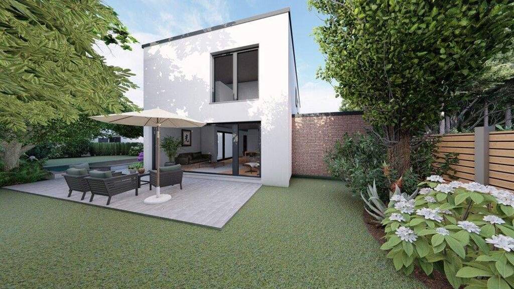 familienhaus im modernen Bauhausstil. Das freistehende Neubauhaus überzeugt mit zwei Vollge-