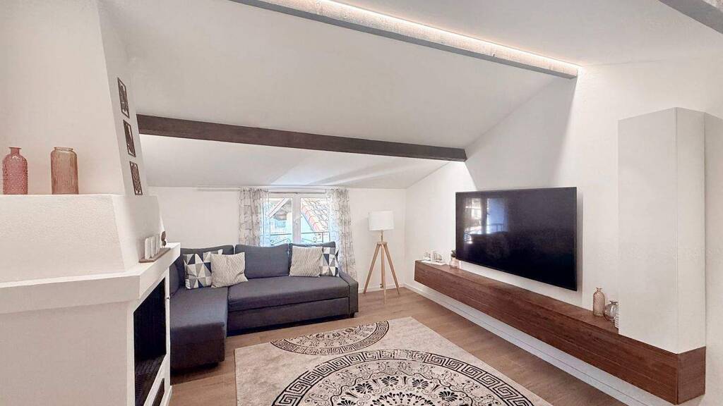 Eine interne Treppe führt auf die nächste Wohnebene: Dort erwartet Sie ein großzügiger Wohnbereich mit gemütlichem Holzkamin, der sofort eine warme und stilvolle Atmosphäre schafft. Auf derselben Etage befinden sich zudem zwei weitere Schlafzimmer, ein komfortables Duschbad sowie ein praktisches Durchgangszimmer, das flexibel als Ankleide, Arbeitsbereich oder Stauraum genutzt werden kann.