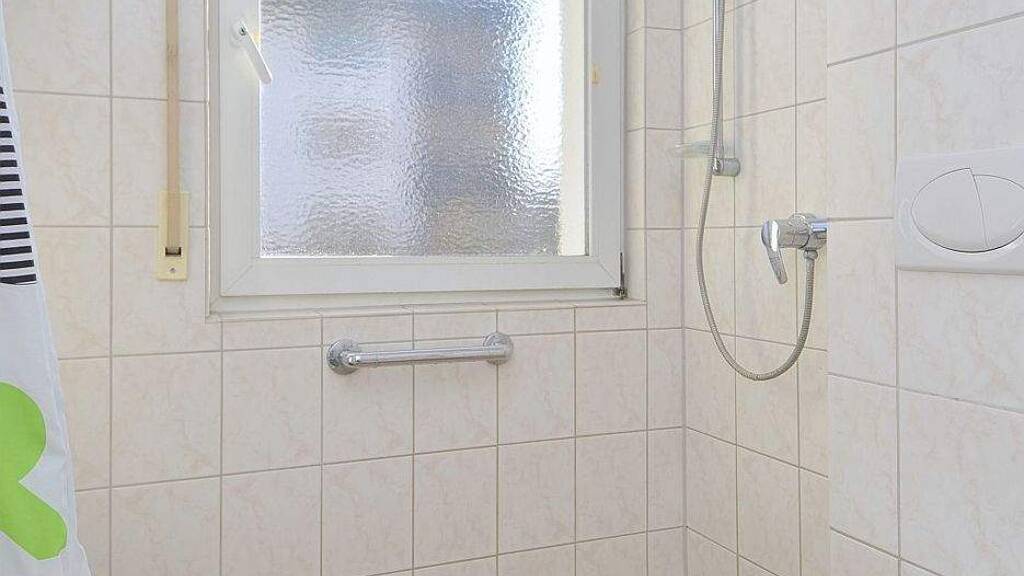 Das hell geflieste Badezimmer ist modern eingerichtet und verfügt über eine ebenerdige Dusche und einer Waschmaschine. Die Waschmaschine und das Badezimmer werden ebenfalls gemeinschaftlich genutzt.