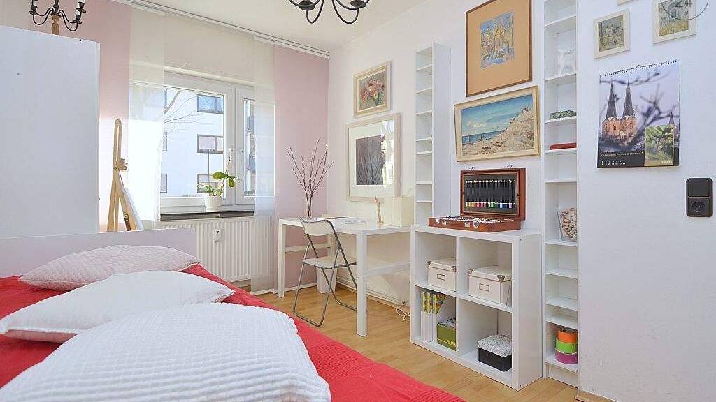 Das stilvolle Schlafzimmer ist mit einem Einzelbett (100 x 200 cm), einem Schreibtisch, einem Bücherregal und einem Kleiderschrank eingerichtet, der viel Platz für die persönlichen Dinge bietet.