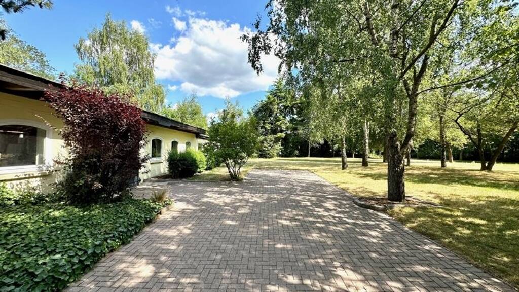 Im Außenbereich des 11.386 m² großen Grundstücks befindet sich unter anderem ein stilvoller Koi-Teich und ein Stallgebäude mit angrenzender Weide für die geliebten Vierbeiner (2 Pferdeboxen sind vorhanden).
