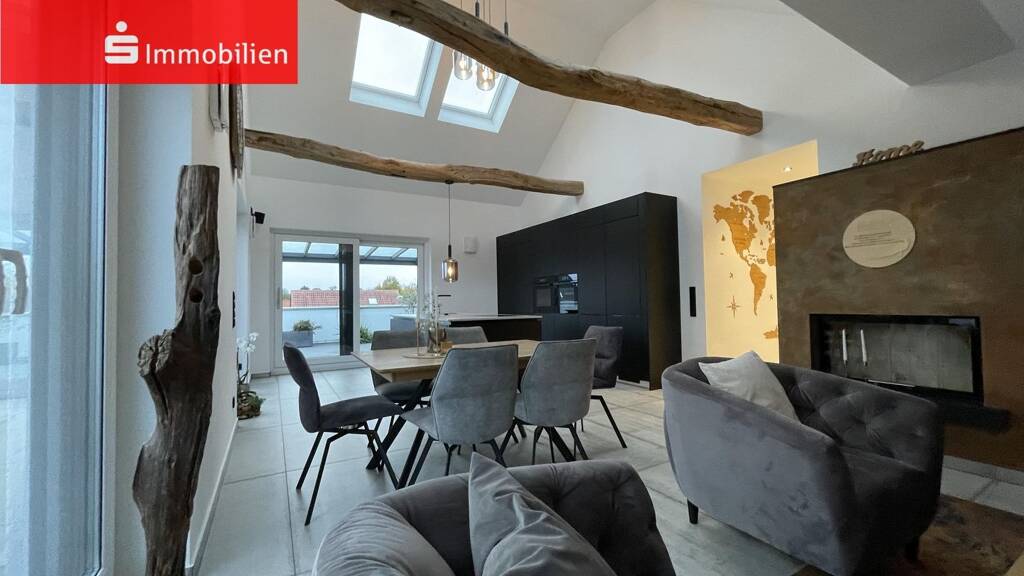 Schon der Zugang über das gepflegte Treppenhaus mit Aufzug bereitet den Weg in eine Wohnatmosphäre, die ihresgleichen sucht. Beim Eintritt in den offenen Lebensbereich entfaltet sich ein spektakuläres Raumgefühl: eine lichte Höhe von bis zu rund 5,50 Metern, eine bewusst freigelegte Dachkonstruktion mit alten Holzbalken und ein eindrucksvolles Zusammenspiel aus großen Terrassenfenstern und zusätzlichen Dachfenstern sorgen für eine beeindruckende Inszenierung von Licht und Weite. Hier verschmelzen Architektur und Atmosphäre zu einem modernen Loftcharakter, der dennoch warm und einladend wirkt. Die elegante Designküche mit großzügiger Kochinsel bildet das Herz dieses weitläufigen Raumes, ergänzt durch einen stilvollen Kamin und ein integriertes Soundsystem, das den Wohnkomfort auf ein neues Level hebt.