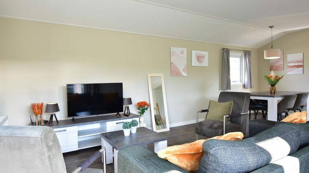 Das moderne Wohnzimmer bildet das Herz dieses Ferienhauses mit einer offenen Aufteilung, die nahtlos in die Küche übergeht. Die räumliche Ausstrahlung wird durch die großen Terrassentüren verstärkt, die für viel natürliches Licht und wunderschönen Blick auf den grünen Garten von 296m² sorgen. Die neutralen Farben und moderne Einrichtung schaffen eine ruhige, einladende Atmosphäre. Das TV-Möbel und der Couchtisch bieten allen Komfort für Entspannung nach einem Tag voller Aktivitäten. Die Terrassentüren zur Terrasse schaffen eine perfekte Innen-Außen-Verbindung, ideal um die niederländischen Sommer zu genießen. Dieses Wohnzimmer bietet die ideale Kulisse für Geselligkeit während Ihres Urlaubs im EuroParcs De Rijp.