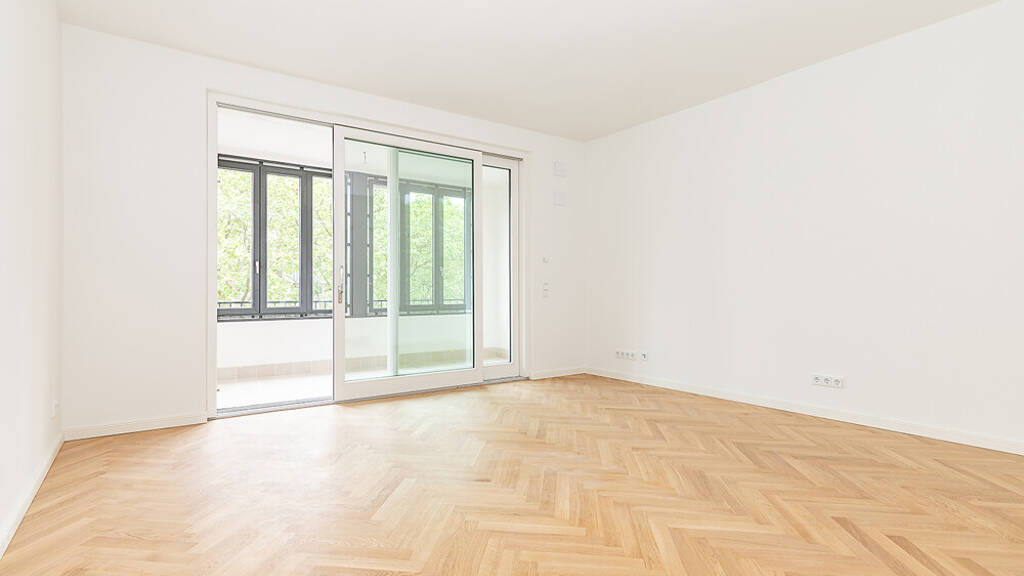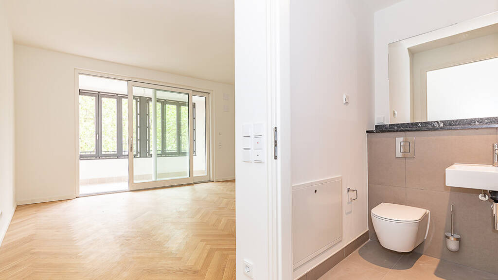 Diese praktische 1-Zimmer-Wohnung im 5. OG besticht durch Ihren effizienten Grundriss, die edle und hochwertige Ausstattung und den tollen Ausblick. Die Wohnung wird durch einen kompakten Flur erschlossen, von dem das Duschbad und der ca. 22 m² nach Westen ausgerichtete Wohn- und Kochbereich abgehen. Dieser wird durch einen ca. 6 m² großen Wintergarten erweitert. Die geschmackvolle und hochwertige Ausstattung zeigt sich in dem edlen Fischgrätparkettfußboden, in profilierten, hohen Türen mit erlesenen Beschlägen, in der modernen und zeitlosen Badausstattung mit bodengleicher Dusche, großformatigen Feinsteinzeugfliesen, Natursteinablagen, Badkeramiken von Grohe, Globo und Kaldewei und Armaturen von Grohe. Die Deckenhöhen von 2,88 m und die Fußbodenheizung unterstreichen den gehobenen Wohnkomfort.