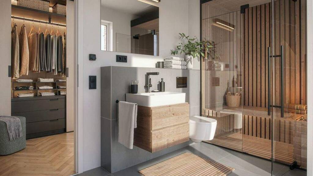 Für flexible Raumlösungen werden Schiebetüren vorgesehen und im Bad sorgt ein Doppelwaschtisch für reibungslose Abläufe - besonders praktisch, wenn morgens beide gleichzeitig starten.