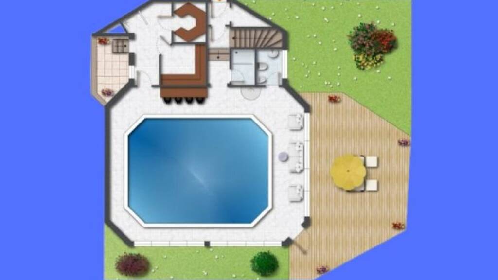 Im Untergeschoß befindet sich ein 30 qm großer Praxisraum, ein Raum mit Solarium, ein Gäste-WC ein Heizraum und ein Technikraum. Das Schwimmbad ist mit der hochwertigen Technik von Ospa ausgestattet, es hat eine Wassertiefe von 1,30 Meter. Die Reinigung des Beckenwassers erfolgt ohne Chlor auf elektrolytischer Basis.