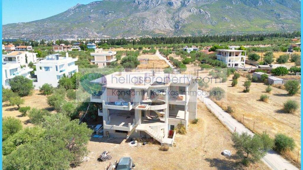 In traumhafter Lage, ca. 10 Autominuten von Loutraki entfernt, befindet sich dieses freistehende Haus in Hanglage mit Meerblick. Das Grundstück ist nur 1 km vom Meer entfernt.