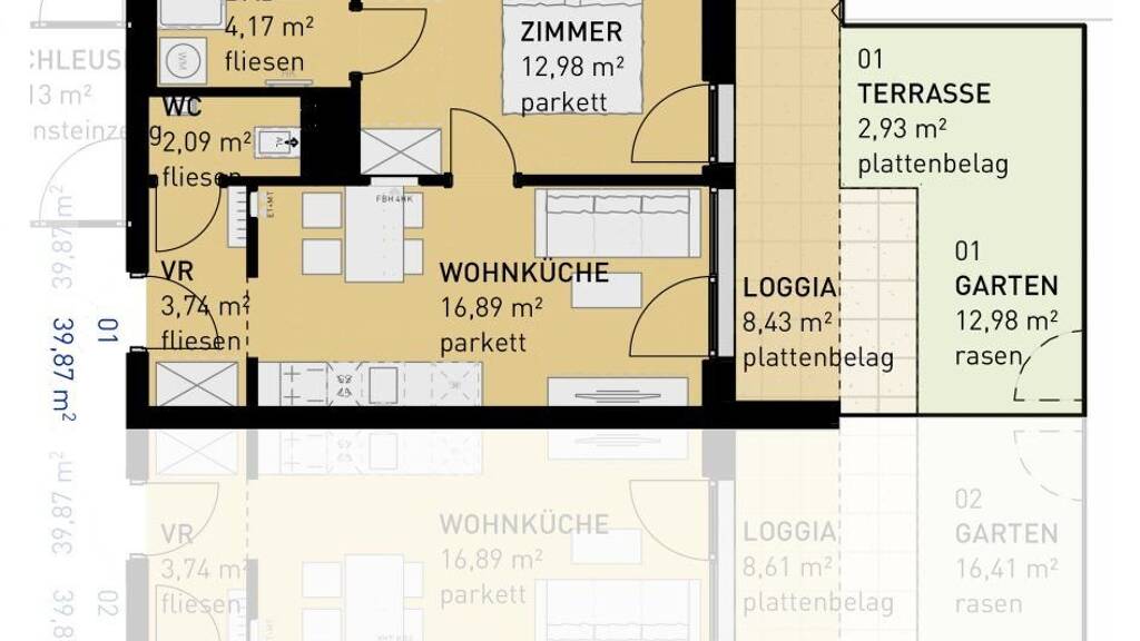 Sollten Sie mehr Platz benötigen, planen wir auch gerne eine größere Wohnung (zB eine 4-Zimmer-Wohnung anstelle von zwei nebeneinander liegenden 2-Zimmer-Wohnungen) für Sie. Fragen Sie einfach bei unserem Vertrieb nach!
