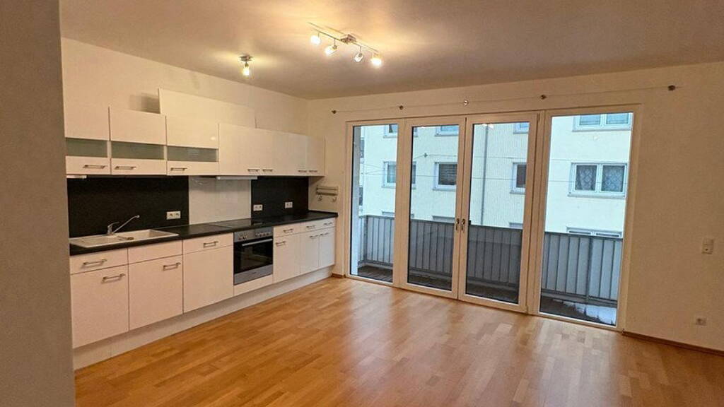 Großzügiges Wohnen: Ca. 40 m² Wohn-/Essbereich mit offener Küche und Zugang zum Süd-Balkon.