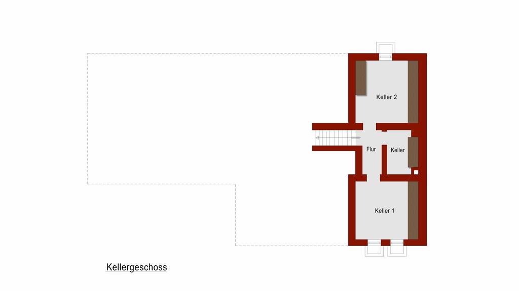 Das Erdgeschoss mit einer Wohnfläche von ca. 90 m² umfasst ein Wohnzimmer, eine Küche sowie vier Schlafzimmer und ein Bad mit Wanne.