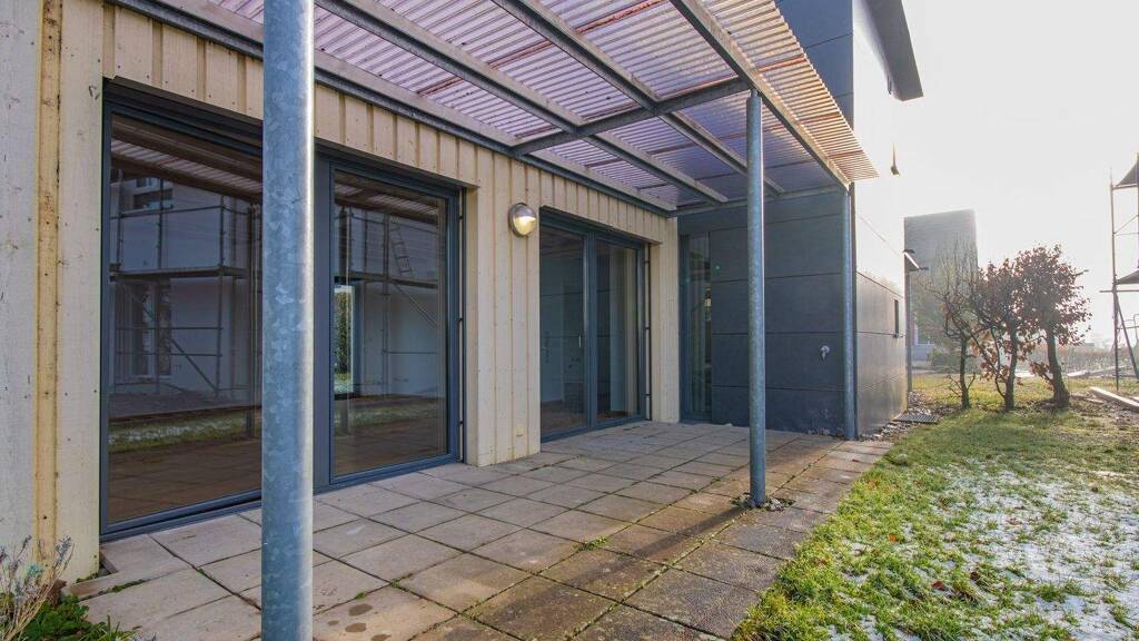 Das großzügige Wohn- und Esszimmer bildet das Herzstück des Hauses. Große Fensterflächen sorgen für viel Tageslicht und ein angenehmes Wohngefühl. Von hier aus gelangt man direkt auf die überdachte Terrasse, die zu entspannten Stunden im Freien einlädt. Eine weitere Tür führt auf die gegenüberliegende Seite des Hauses in den Garten mit angrenzender Grünfläche.