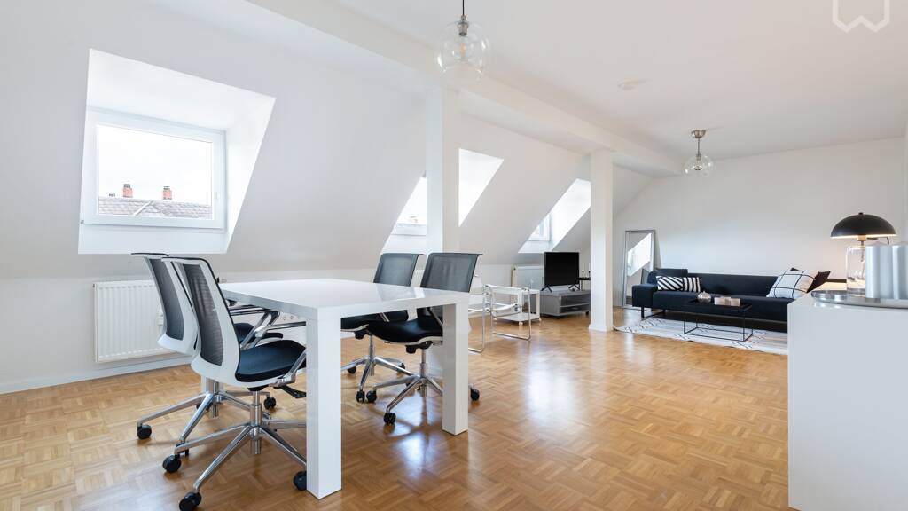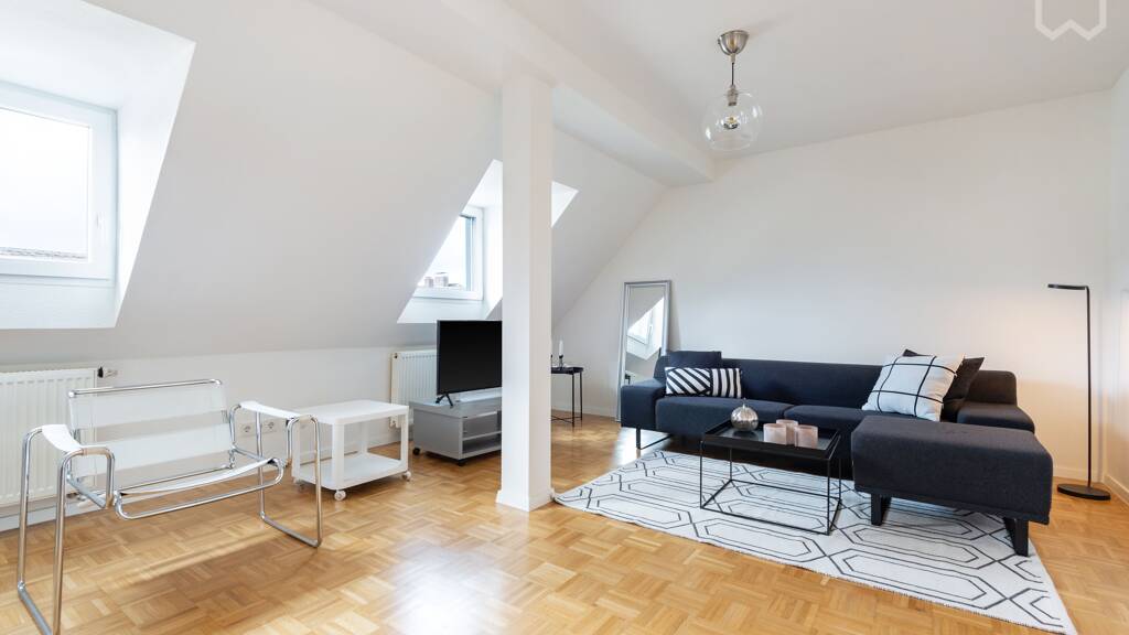 This appealing property is a newly refurbished and fully furnished apartment on the fourth floor, which boasts an upscale and stylish interior. The apartment impresses with its light-filled, spacious living / dining area with loft-like flair. The very nice bright bedroom (with 1,60m [Queen-size+] boxspring bed and large wardrobe) has an en-suite bathroom with plenty of natural light and bathtub. A fully equipped and spacious kitchen is at your disposal. There is also a separate guest toilet. Practical is the storage room, which can also be used as a dressing room. The last modernization took recently place, in 2019. A current energy certificate is available. Also pay attention to the garden, where it is wonderful to recover from everyday life.