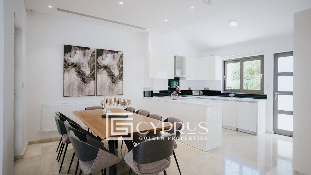 The outdoor area is a private oasis, with a swimming pool set amidst a large mature garden, offering a serene backdrop for relaxation or entertaining. A designated BBQ area enhances the outdoor lifestyle, perfect for al fresco dining in the Cypriot sun. Inside, the villa comes fully furnished and equipped, with air conditioning and central heating throughout to ensure year-round comfort and convenience.