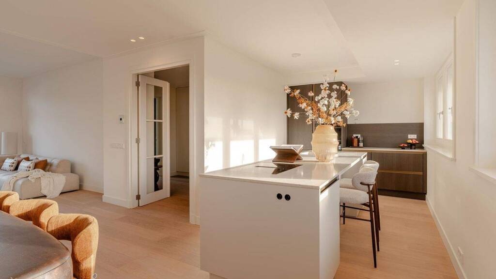 the open-plan kitchen is a true eye-catcher, fitted with high-quality built-in appliances: an induction hob with integrated extractor, dishwasher, combi-oven and quooker tap. the combination of sleek handleless cabinetry and warm wooden accents gives this floor a modern yet inviting feel. from the living room you have access to a sunny southeast-facing balcony, perfect for a morning coffee or an afternoon drink in the sun.