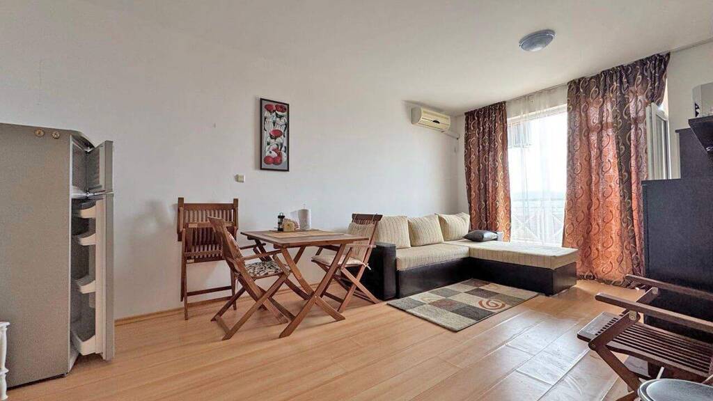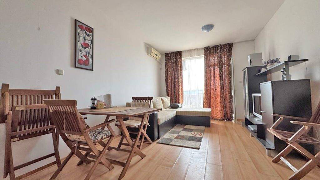 Die Wohnung ist vollständig möbliert und verfügt über ein helles Wohnzimmer mit integriertem Küchenbereich, ein separates Schlafzimmer, ein Badezimmer mit Dusche sowie einen Balkon mit Blick auf das Feld. Sie ist mit Klimaanlage, modernen Möbeln, Bodenfliesen und Kunststofffenstern mit Doppelverglasung ausgestattet. Der Komplex bietet gepflegte Gemeinschaftsbereiche, Grünflächen und Parkmöglichkeiten in der Nähe.
