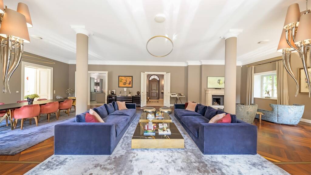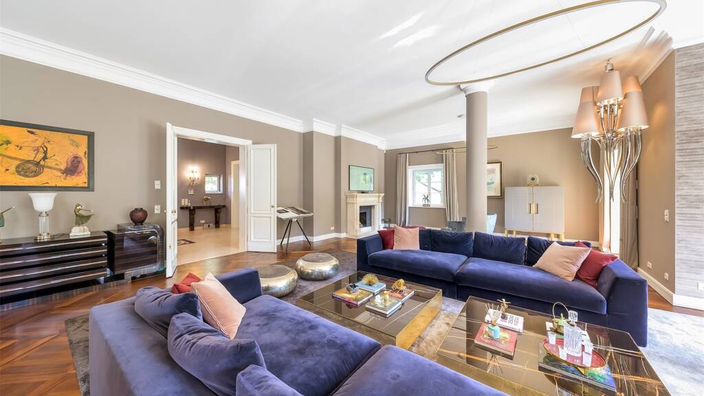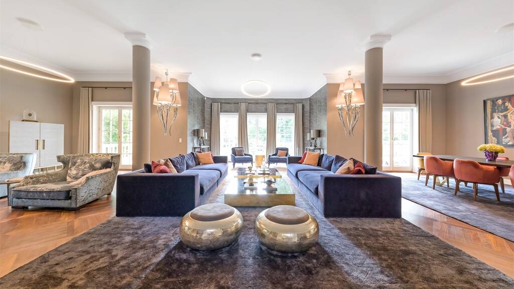 Beletage / Hochparterre:großzügiger Empfang mit stilvollem Aufgang zum Obergeschoss sowie Fahrstuhl, Gäste-WC, Garderobe, großzügiges Wohn- und Speisezimmer (ca. 110 qm) mit Parkett, Kamin und Zugang zur Sonnenterrasse, Bibliothek/Kino, große Wohnküche mit Frühstücksraum