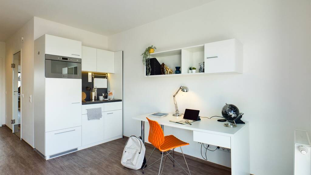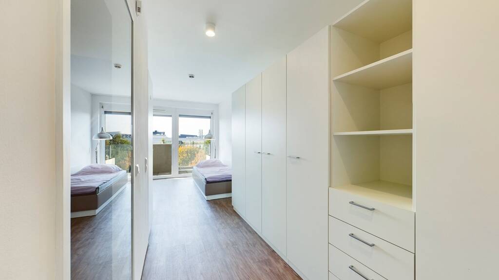 Im Haus erwarten dich ebenfalls ein cooles Restaurant, ein Café und ein Fitnessstudio. Und hast du Lust auf Gesellschaft, kannst du dich auf zahlreiche Community-Flächen und eine große Learning Lounge mit Außenanlage freuen.