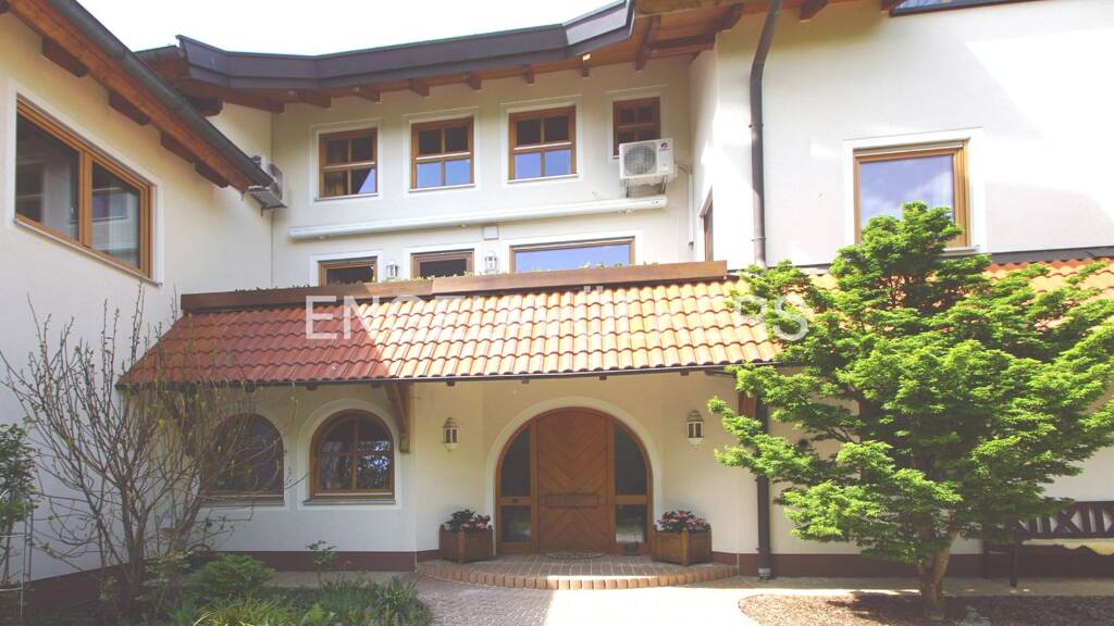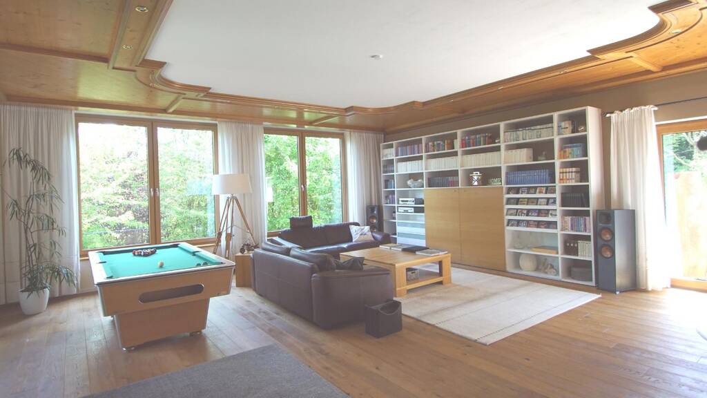 Dieses Anwesen mit Einliegerwohnung überzeugt durch eine außergewöhnliche Großzügigkeit, vielfältige Nutzungsmöglichkeiten und eine exklusive Ausstattung auf insgesamt ca. 540 m² Wohnfläche. Es befindet sich auf einem ca. 17.345 m² großen Grundstück in unverbaubarer Alleinlage und bietet sowohl im Innen- als auch im Außenbereich ein sehr hohes Maß an Wohn- und Lebensqualität. Bereits im Untergeschoss eröffnet sich über einen repräsentativen Eingangsbereich der Zugang zu den angrenzenden Wohn- und Gästebereichen, Hauswirtschaftsräumen, der Heizungs- und Pooltechnik sowie ein direkter Zugang zur integrierten Doppelgarage mit angrenzender Werkstattfläche. Die technische Ausstattung umfasst unter anderem eine moderne Wärmepumpe, eine Photovoltaikanlage, eine Solarthermieanlage sowie eine Not-Ölheizung zur Absicherung - eine Kombination, die für hohe Energieeffizienz und Versorgungssicherheit sorgt. Über eine offene Treppenanlage gelangt man in das Obergeschoss, das den zentralen Wohnbereich des Hauses bildet. Herzstück ist das ca. 60 m² große Wohnzimmer mit bodentiefen Fensterflächen und direktem Zugang zur südwestlich ausgerichteten Terrasse am Außenpool. Daneben befindet sich das holzvertäfelte Esszimmer mit ebenfalls direktem Terrassenzugang. Die angrenzende, separate Wohnküche mit Speisekammer bietet ausreichend Platz für den Alltag und hat einen eigenen Balkon. Zusätzlich stehen ein großzügiges Schlafzimmer mit Balkonzugang, zwei separate WCs, ein Saunabereich mit eigenem Duschbad sowie der großzügige Innenpool mit Whirlpool zur Verfügung. Das Dachgeschoss wird über einen zentralen Atriumflur erschlossen. Hier befinden sich zwei großzügige Kinderzimmer, ein weiteres Schlafzimmer mit Westbalkon, ein separates Wohnzimmer, das Hauptbadezimmer mit Wanne und Dusche, ein Ankleidezimmer, ein Gäste-WC sowie ein separater Fitnessraum mit Weitblick in die Natur. In einigen Räumen im Dachgeschoss wurden Klimageräte installiert, die auch an heißen Tagen für angenehme Temperaturen sorgt. Das weitläufige Grundstück gliedert sich in Gartenflächen, Waldanteile und Grünland. Die Außenanlage ist, rund um das Haus gepflastert und umfasst mehrere, teils überdachte Sitzbereiche sowie den privaten Tennisplatz. Eine zusätzliche Dreifachgarage mit großzügiger Vorfläche ergänzt das Platzangebot. Ein Anwesen mit vielfältigem Nutzungspotenzial - ideal für Familien, kombinierte Wohnformen oder Selbstständige mit Platzbedarf. Weitere Details erläutern wir Ihnen gern in einem persönlichen Gespräch.