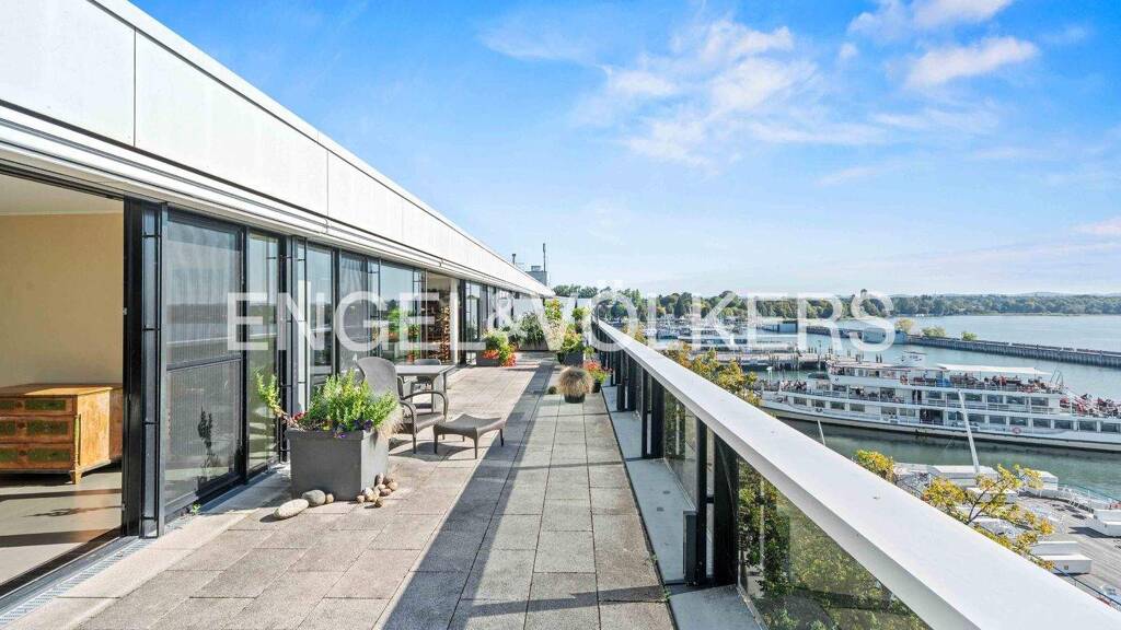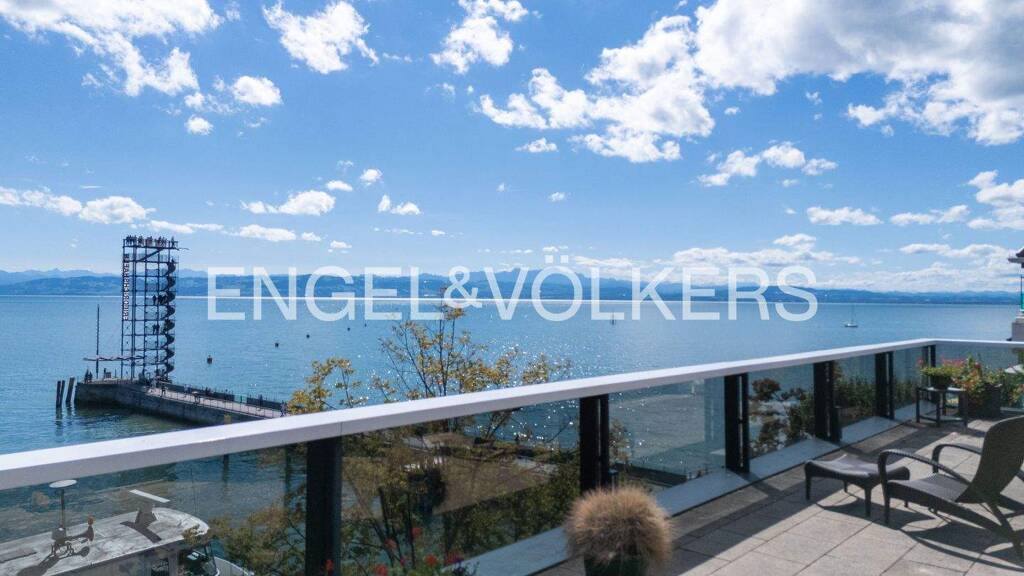 Dieses außergewöhnliche Penthouse im exklusiven K42 an der Seepromenade bietet Ihnen Wohnen der besonderen Art mit einem unvergleichlichen 180°-Panoramablick über den Bodensee und die Alpen. Mit ihren 334 m² ist sie eine der größten am gesamten Bodensee und vereint Großzügigkeit, Exklusivität und ein einzigartiges Raumgefühl. Die über 20 m lange, bodentiefe Fensterfront, mit Zugang zur Terrasse in Südostausrichtung, eröffnet Ihnen ein Panorama, das vom Sonnenaufgang über den Bergen bis zum Sonnenuntergang über dem See reicht. Derzeit verteilt sich die Fläche auf fünfeinhalb Zimmer - Anpassungen oder Umgestaltungen des Grundrisses können sich durch die große Fläche nach Bedarf umsetzen lassen. Ursprünglich plante der Projektentwickler hier zwei Penthouse-Wohnungen. Entsprechend sollte baulich auch eine spätere Aufteilung möglich sein. Deshalb verfügt die Wohnung aktuell über zwei separate Eingänge, zwei Ankleidezimmer, zwei Badezimmer sowie eine weitere Terrasse Richtung Innenstadt. Die Ausstattung erfüllt höchste Ansprüche: Großformatige Fliesen, eine Kombination aus bodentiefen Alu-Fenstern mit Wärmeschutzverglasung, Acryl-Lichtkuppeln und großflächigen Dachfenstern für maximale Helligkeit. Die Fußbodenheizung sorgt für behagliche Wärme und die integrierte Deckenkühlung sorgt auch im Hochsommer für kühlere Räume. Mit der Schlüsselschaltung im Aufzug gelangen Sie diskret und komfortabel von der Tiefgarage in Ihre Penthouseebene. Abgerundet wird das Angebot durch vier Stellplätze in der Tiefgarage sowie zwei separate Kellerräume. Dieses exklusive Penthouse ist ideal für anspruchsvolle Käufer die Aussicht, Großzügigkeit und Exklusivität zu schätzen wissen. Eine Gelegenheit, die sich nur äußerst selten am Bodensee bietet!