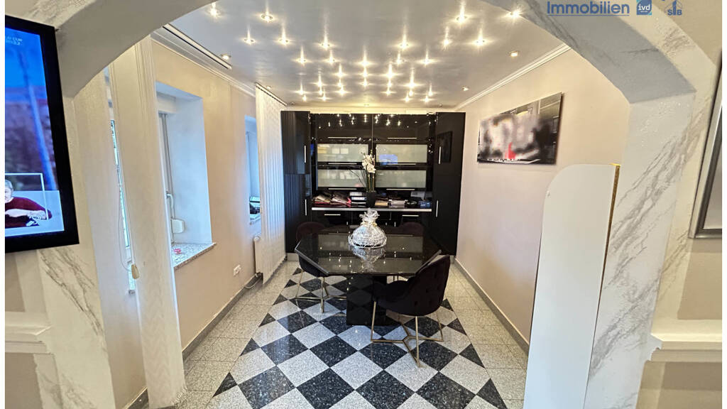 Die Innenausstattung besticht durch höchste Qualität und geschmackvolles Design: Designer-Fliesen, edler Marmor und Stuckimitate sowie integrierte LED-Deckenspots schaffen ein luxuriöses Ambiente. Die hochwertigen Sanitärausstattungen lassen keine Wünsche offen und bieten ein Gefühl von Wellness in den eigenen vier Wänden. Eine exklusive Einbauküche (Neupreis 20.000,- €) kann übernommen werden und fügt sich nahtlos in das stilvolle Gesamtbild ein.