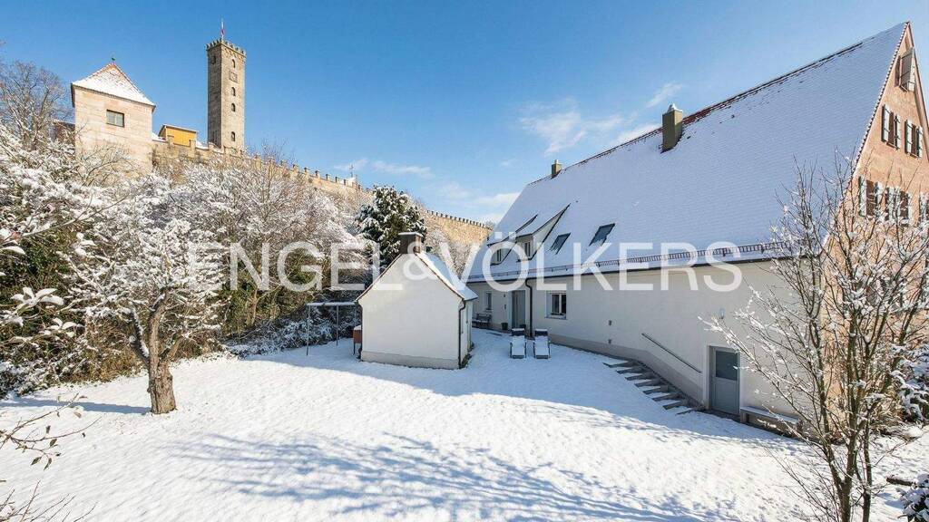 Am Fuße der geschichtsträchtigen Burg Abenberg liegt dieses ensemblegeschützte Stadthaus auf einem großzügigen Grundstück von ca. 1.250 m². Mit einer Wohnfläche von rund 228 m² bietet es die perfekte Balance aus historischem Charme und modernem Wohnkomfort. 2021 wurde das Anwesen kernsaniert und präsentiert sich heute als ein Zuhause, das Tradition und zeitgemäße Ansprüche in harmonischer Weise vereint. Der straßenabgewandte Eingang führt in einen hellen, einladenden Flur. Von hier gelangt man einerseits in die moderne Küche mit angrenzender Speisekammer und direktem Gartenzugang, andererseits in das großzügige Esszimmer. Große Fensterflächen, ein moderner Kaminofen und ein zusätzlicher Austritt in den Garten schaffen hier eine helle und zugleich gemütliche Atmosphäre - ideal für Familienleben und gesellige Abende. Ein Büro mit integriertem Wohnbereich, ein Gästezimmer sowie ein stilvolles Badezimmer ergänzen das Erdgeschoss. Eine schöne Eichenholztreppe führt ins Obergeschoss, wo zwei geräumige Kinderzimmer, ein Schlafzimmer und ein Ankleidezimmer Platz für die ganze Familie bieten. Freigelegte Balken verleihen den Räumen dabei ihren unverwechselbaren Charakter. Ein weiteres Badezimmer sorgt für weiteren Komfort. Darüber hinaus gibt es einen noch nicht ausgebauten Raum sowie den vorbereiteten Dachboden. Das Dach wurde 2022/2023 neu gedeckt und mit Aufbaudämmung versehen - ein gelungenes Beispiel für die Verbindung von historischer Substanz und moderner Bauweise. Der weitläufige Garten ist ein Highlight dieses Anwesens. Die beiden zusammenhängenden Flurstücke schaffen außergewöhnliche Großzügigkeit und vielfältige Nutzungsmöglichkeiten. Von der sonnigen Terrasse eröffnet sich ein eindrucksvoller Blick auf die Burg Abenberg. Ein Saunahaus, eine Feuerstelle und mehrere idyllische Sitzplätze machen den Außenbereich zu einem Ort der Erholung und Begegnung. Je nach Jahreszeit lassen sich hier die Sonnenuntergänge an wechselnden Stellen des Gartens genießen. Eine Garage mit elektrischem Doppeltor, eine Werkstatt und Nebenräume bieten Stauraum und Komfort und runden das Angebot ab. Beheizt wird das Haus über eine Gasheizung (1991), die durch den Kaminofen ergänzt wird. Die Fassade wurde 2023 erneuert, wobei die historische Sandsteinseite stilvoll erhalten geblieben ist. Mit seiner besonderen Lage ist dieses Stadthaus ein ideales Zuhause für alle, die den Charakter historischer Architektur schätzen, aber nicht auf die Annehmlichkeiten modernen Wohnens verzichten möchten.