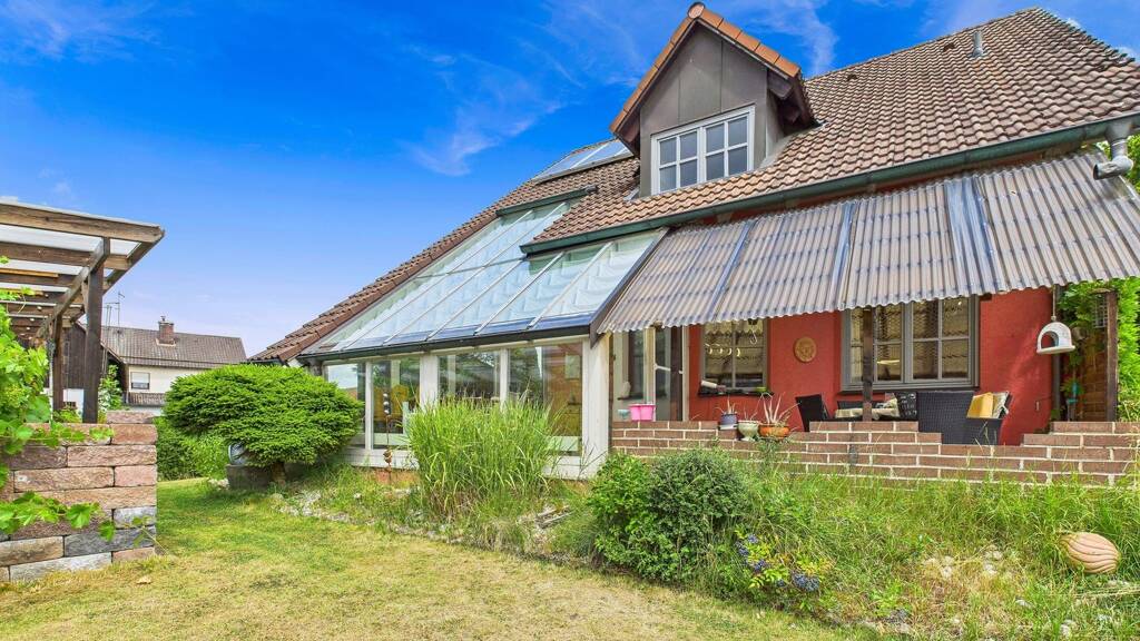 * Freistehendes Einfamilienhaus in ruhiger, nach hinten versetzter Sackgassenlage * Vier gut geschnittene Zimmer mit flexibler Nutzung * Gemütliches Wohnzimmer mit rustikaler Holzdecke und Kachelofen * Großzügiger, beheizter Wintergarten - ganzjährig nutzbar * Separate, geräumige Wohnküche inkl. Einbauküche * Modernisiertes Tageslichtbad im Obergeschoss * Gäste-Badezimmer mit Dusche im Erdgeschoss * Balkon mit Blick ins Grüne, von allen Zimmern im OG zugänglich * Vollunterkellert mit großem Hobbyraum, Hauswirtschafts- und Technikraum * Überdachte Terrasse und zusätzlicher Freisitz mit Pergola * Großer, gepflegter Garten mit Weinreben und Gartenhaus * Einzelgarage mit zusätzlichem Stauraum * Ideale Familienimmobilie mit viel Platz innen und außen