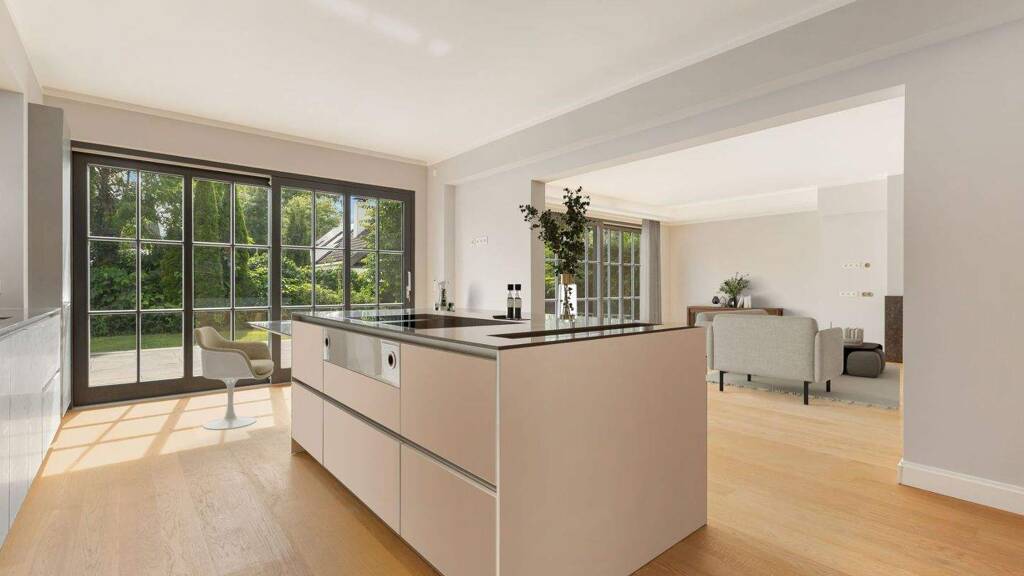 Die offen gestaltete Siematic-Markenküche erfüllt höchste kulinarische Ansprüche. Ausgestattet mit Bora-Kochfeldabzug, Quooker-Heißwassersystem, Backofen, Dampfgarer sowie einem separaten Vorratsraum mit direkter Garagenanbindung verbindet sie Ästhetik mit maximalem Komfort - ideal für private Abende wie auch für repräsentatives Hosting.