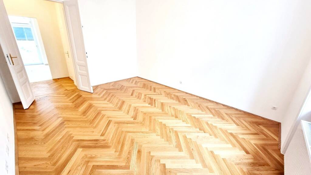 (Es wurden Fotos von einer bereits sanierten Wohnung im unteren Stockwerk verwendet, die Sanierung findet im selben Stil und mit den selben Materialien statt)