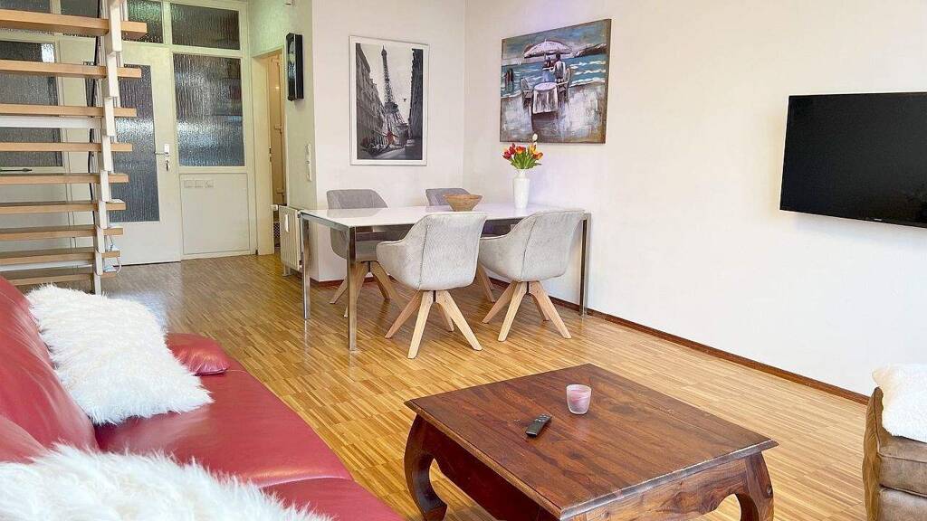 hochwertige, moderne Möblierung, Parkett und Fliesenboden, offene Einbauküche mit Spülmaschine, Mikrowelle, Kaffeemaschine, Ofen, Wannenbad, Kabel und Sat Anschluss, Smart TV, WLAN Internetanschluss mit 100Mbits, Waschmaschine, Fahrradraum